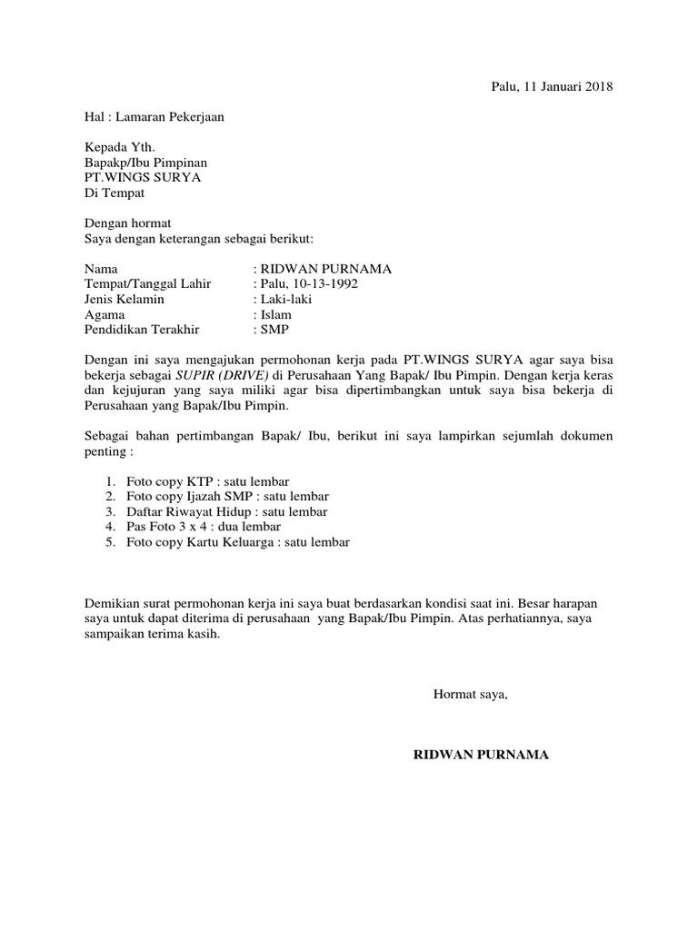 Contoh Surat Lamaran Kerja Sopir Surat Tulisan Cv Kreatif from i.pinimg.com Artinya bahwa indomaret membutuhkan banyak tenaga kerja untuk mengisi berbagai posisi dalam menjalankan. Padahal, ada banyak hal yang harus kamu perhatikan. Akan tetapi, terkadang kita luput bahwa hal yang esensial bukan hanya soal ketertarikan kita pada pekerjaan yang dilamar. Menulis surat lamaran kerja yang baik dan benar merupakan hal yang cukup penting untuk dilakukan bagi calon pelamar kerja supaya mendapatkan respon yang baik sehingga bisa diterima bekerja di tempat tersebut. Surat lamaran kerja sederhana yang bikin hrd terpana. Tempat dan tanggal pembuatan surat. Hari gini masih bingung buat surat lamaran. Membuat surat lamaran kerja memang terlihat gampang.